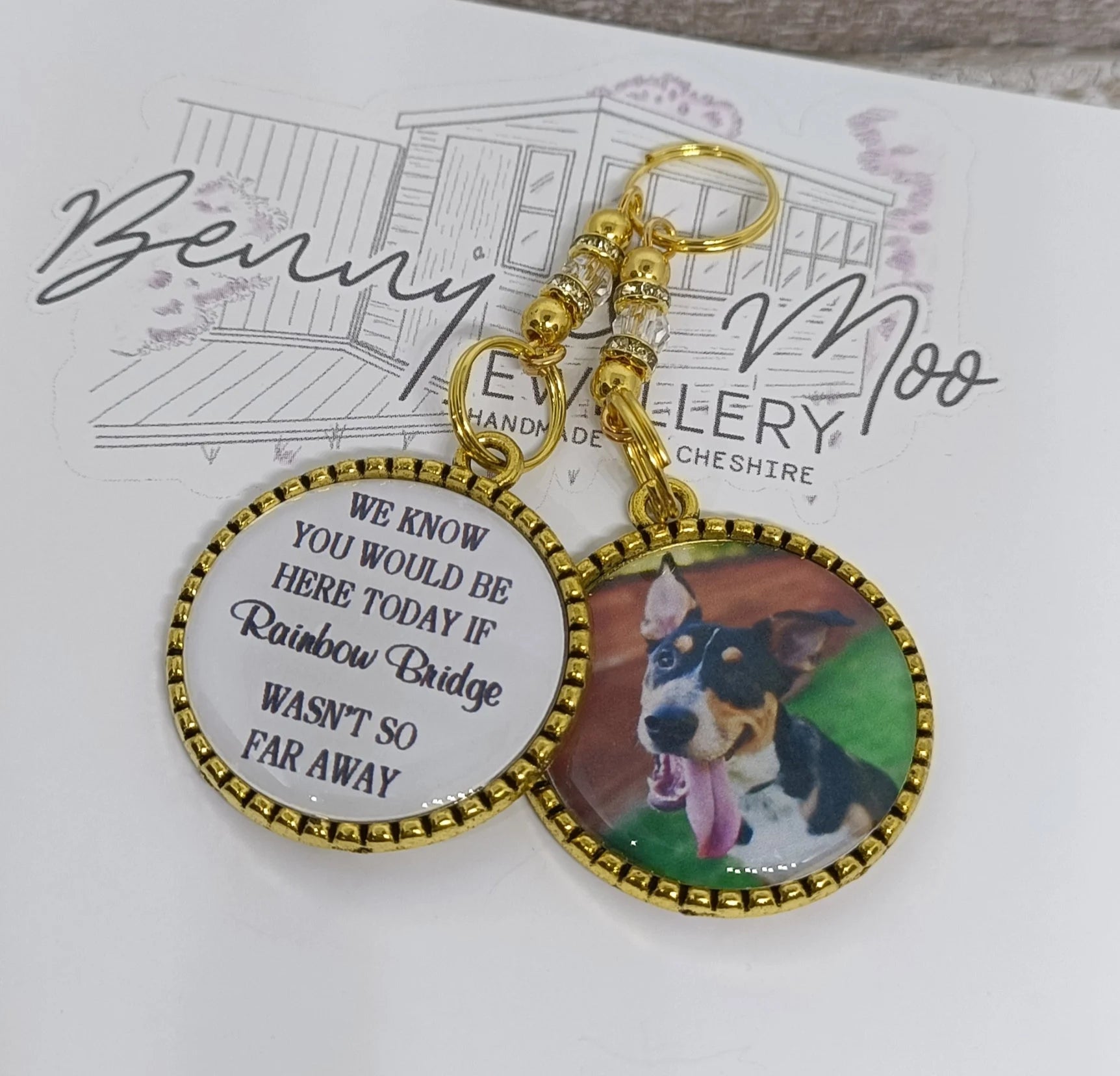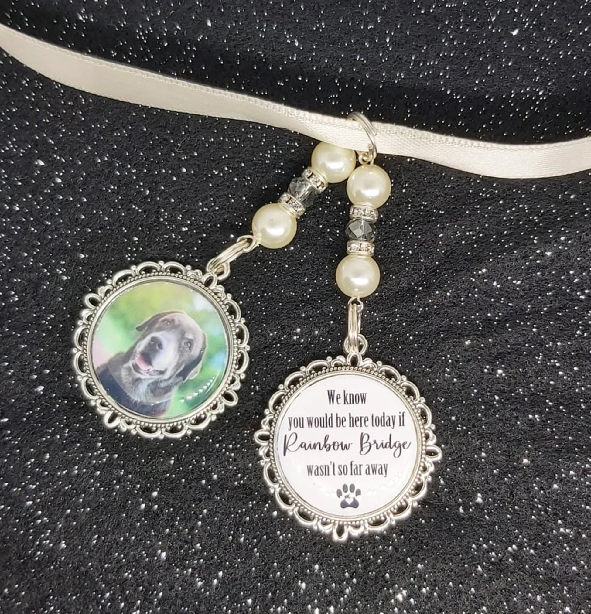 We know you would be here today if rainbow bridge wasn't so far away. Pet photo charm for a bridal wedding bouquet.